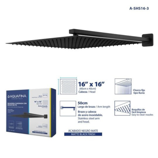 Combo Regadera para Ducha Cuadrada de 16" Ultra Delgada en Acero Inoxidable (Negro Mate)
